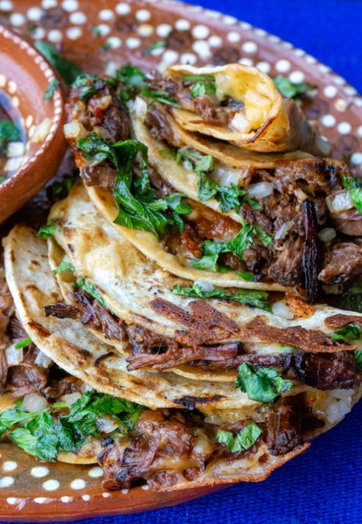 Step Eight: Heat up a skillet over medium heat. Dip corn tortillas in the birria sauce. Make sure the birria sauce is fully covering both sides of corn tortillas because the tortillas will break if they’re too dry. If you’re using a cast-iron skillet, grease pan with oil to prevent tortillas from sticking. You can use a bit of oil for a non-stick pan. It’s important your skillet is hot enough before you start to pan-fry the tortillas. Place corn tortilla on the heated skillet. Layer a handful of grated melting cheese on corn tortilla, then let the cheese melt. Once the cheese has melted and the corn tortilla is a bit crisped, layer some birria meat on the cheese. Fold corn tortilla in half. Serve these birria tacos immediately with dipping sauce and lime slices